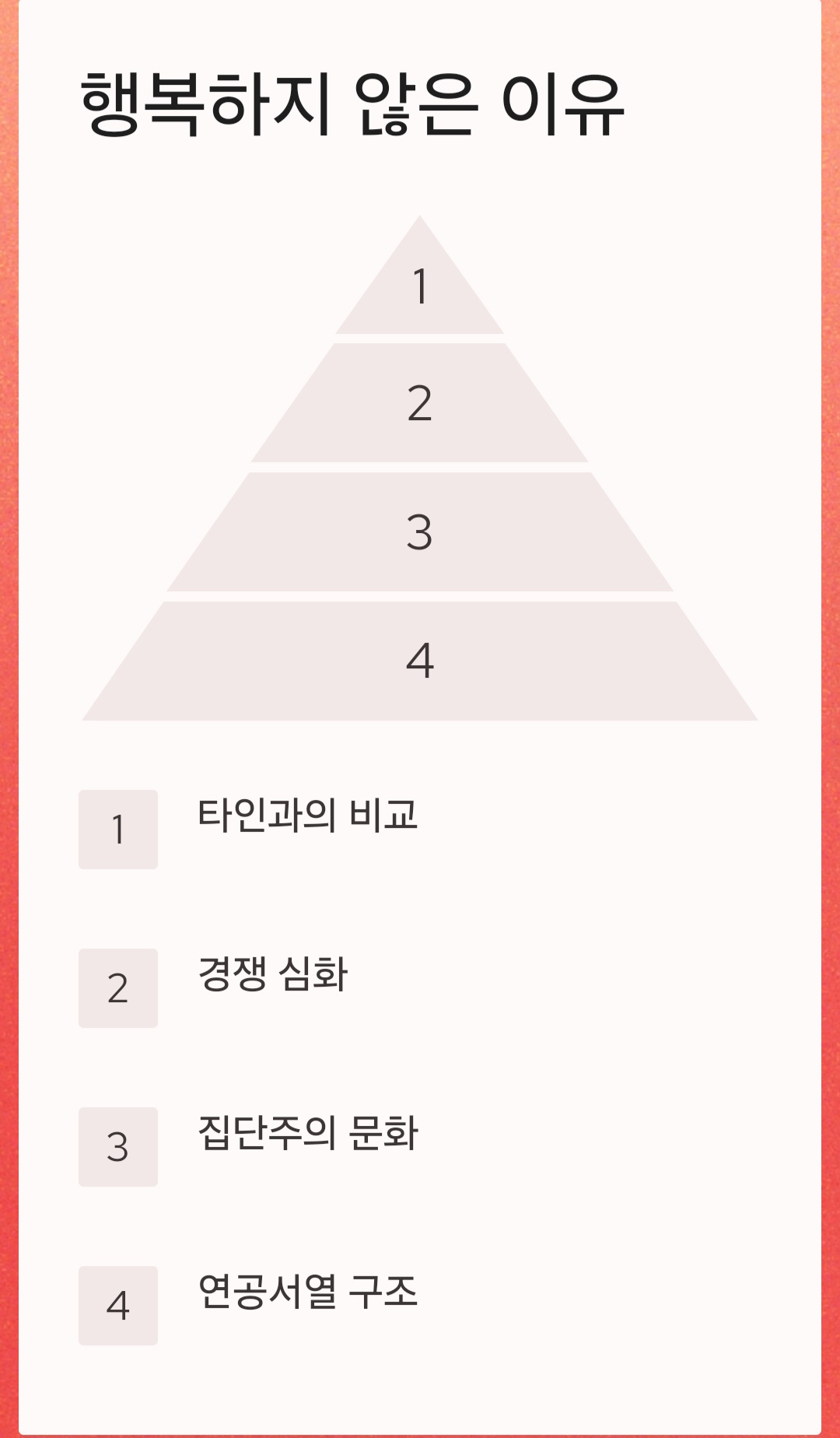 우리가 행복하지 않은 이유는 고립 때문일까? 아니면 집단주의와 타인에 대한 시선 때문일까? 우리는 후진국일 때도 개발도상국일 때도 선진국일 도 자살율은 늘 높았다. 이쯤 되면 돈도 문제지만 그 근본 배경에 다른 큰 요인이 존재함을 짐작케 한다. 바로 타인과의 비교다.